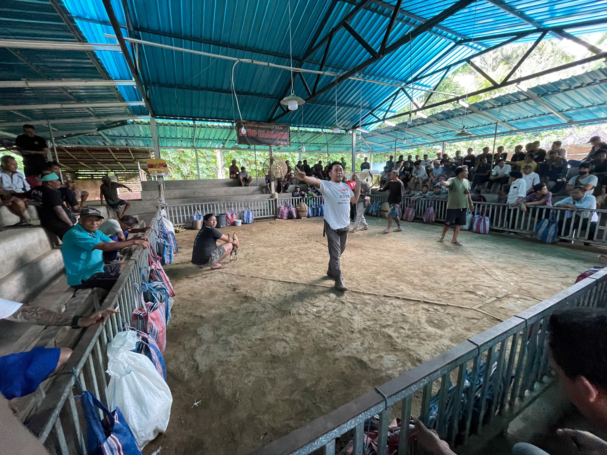 Mi ha guidato in un sentiero nella boscaglia che porta a un largo ring in terra battuta, coperto da ondulati in plastica, attorniato da scommettitori e tifosi urlanti nel rito sociale che precede il combattimento tra due pennuti eccitati alla lotta come dei posseduti.