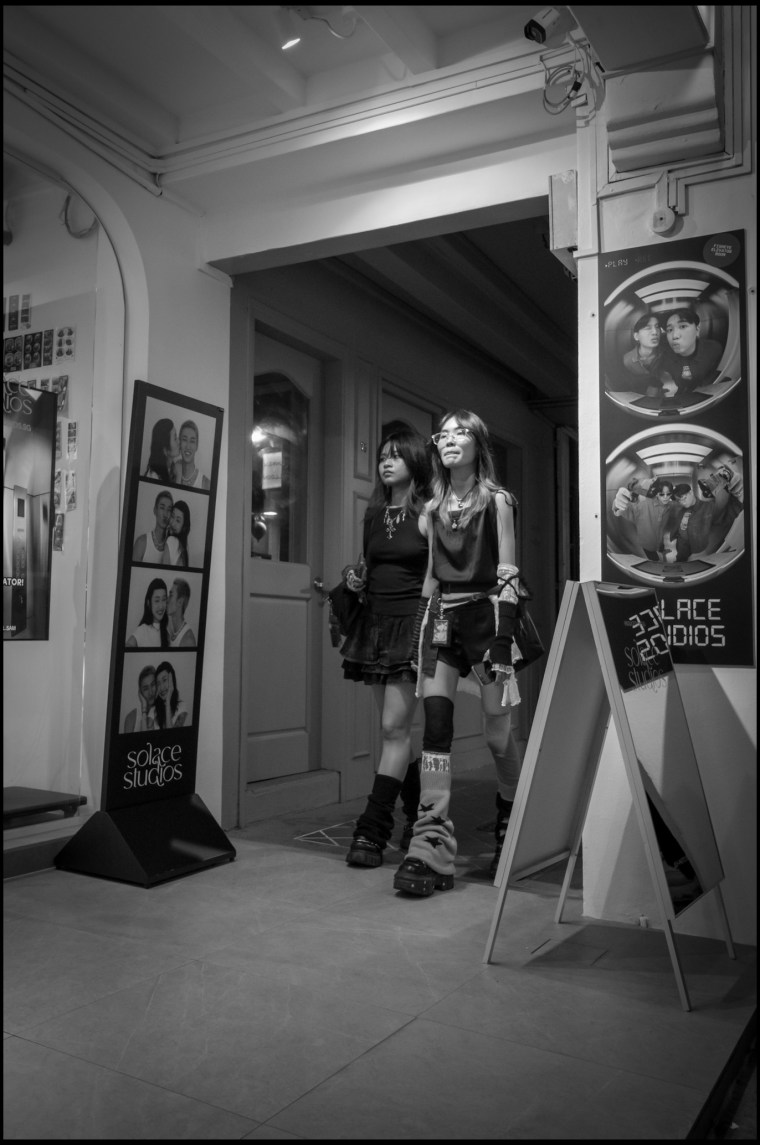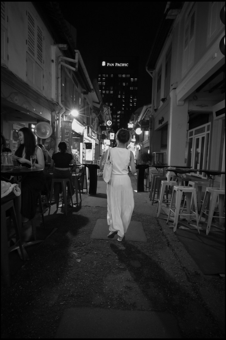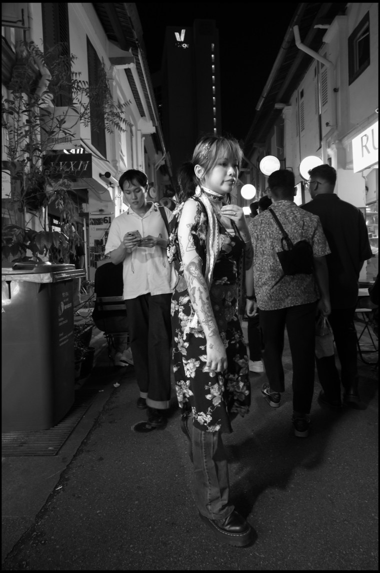 Haji Lane, nestled in the heart of Singapore’s Kampong Glam neighborhood, is a vibrant canvas that blends historical roots with contemporary culture, making it a must-visit destination for tourists and locals alike. This narrow alley, once overshadowed by pre-war shophouses, has transformed into a buzzing enclave of boutique shops, cozy cafes, and eclectic street art, offering a stark contrast to Singapore’s ubiquitous modern skyline. I was there tonight, with my Leica M11Monochrom, that uses even deep blacks as bright lights!