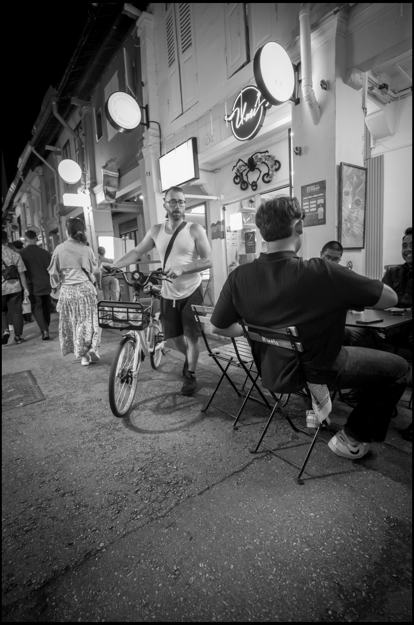 Haji Lane, nestled in the heart of Singapore’s Kampong Glam neighborhood, is a vibrant canvas that blends historical roots with contemporary culture, making it a must-visit destination for tourists and locals alike. This narrow alley, once overshadowed by pre-war shophouses, has transformed into a buzzing enclave of boutique shops, cozy cafes, and eclectic street art, offering a stark contrast to Singapore’s ubiquitous modern skyline. I was there tonight, with my Leica M11Monochrom, that uses even deep blacks as bright lights!