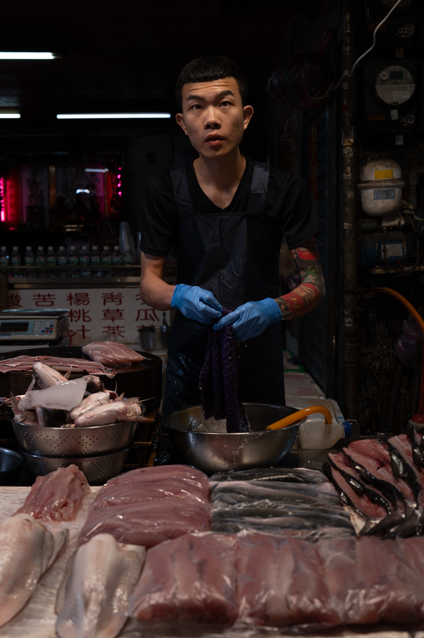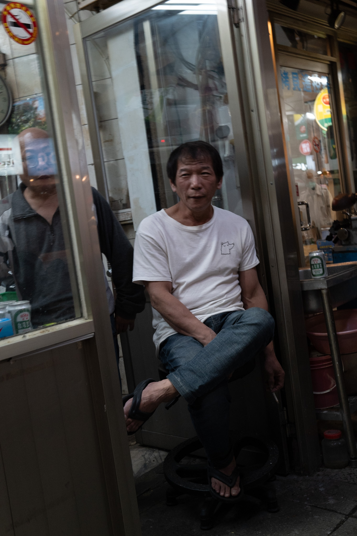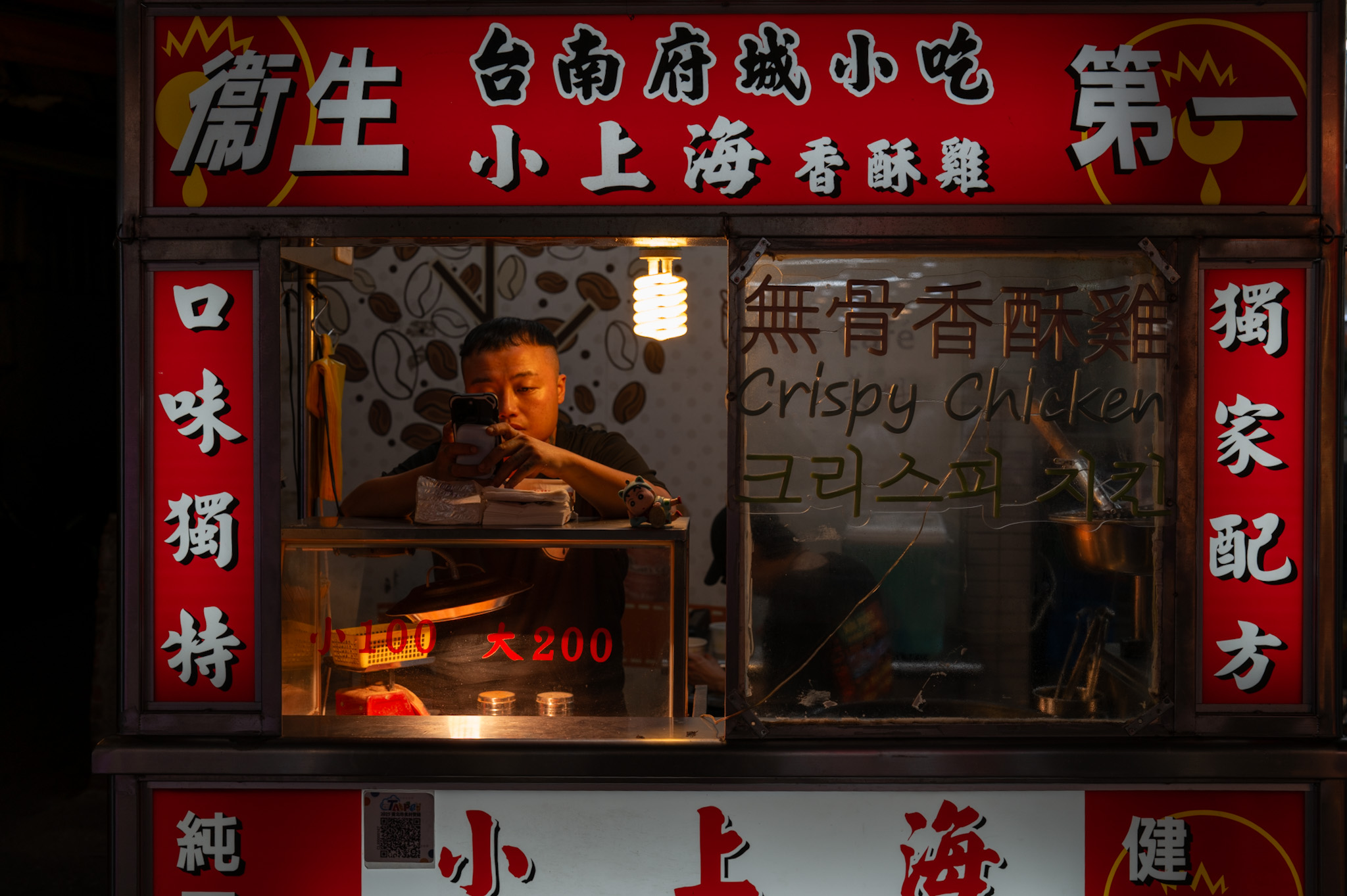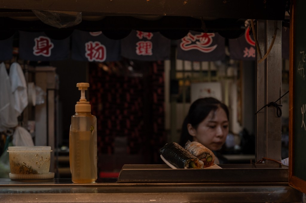 But the market I would return to again and again is Tonghua. Maybe because it’s smaller, more human, or maybe because night photography becomes easier when the chaos is reduced to a few essential gestures. A vendor turning skewers with slow concentration; an auntie pouring oyster batter onto a sizzling pan. Children biting sausage-on-a-stick as if it were an adventure. In those faces I sensed a quiet pride—Taiwanese cuisine is a living thing, passed on like family stories, evolving without ever losing its roots.