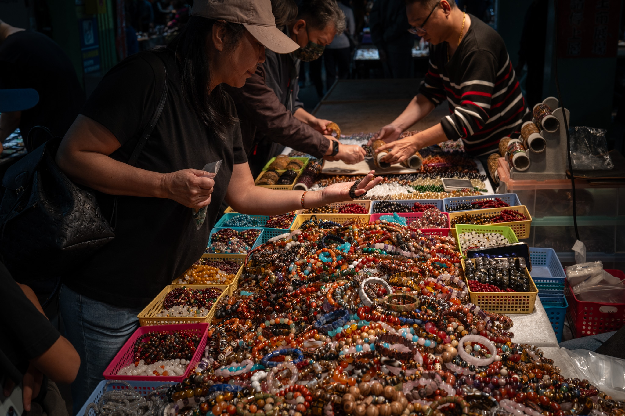 Crossing to the opposite side of the road, the atmosphere shifts. It grows quieter, more concentrated. The Jade Market is like stepping into a different dimension—shades of green, the soft clink of bracelets, the murmured voices of traders, and the deep cultural attachment to jade as a symbol of protection and virtue. Jade in Taiwan is not simply jewelry. It is an amulet, a childhood gift, a mother’s blessing, a memory carved into stone. Parents give jade pendants to children to keep them safe; couples exchange jade for good fortune; elders wear it as a sign of wisdom and longevity.