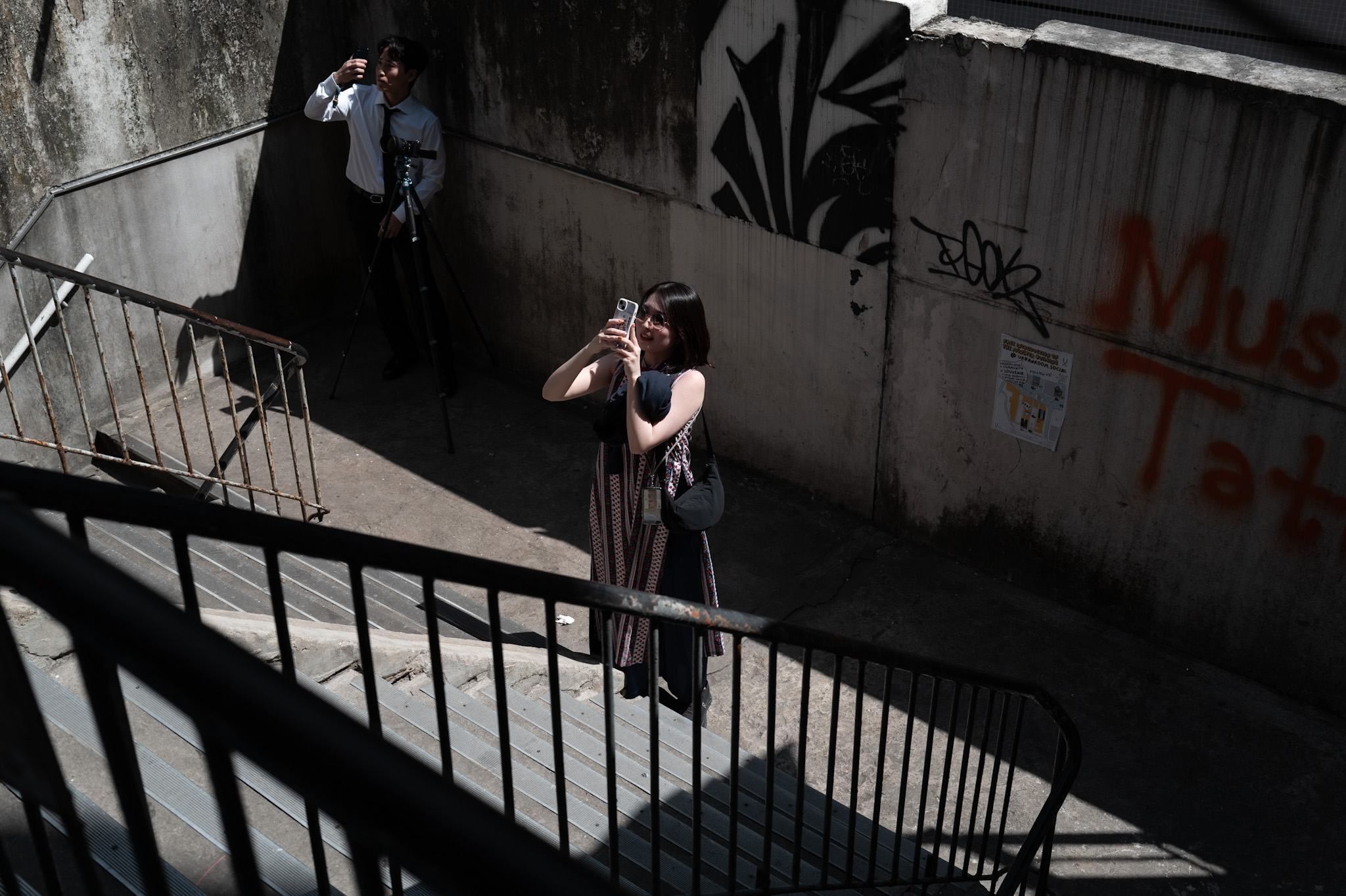 From a photographic point of view, it was a black-and-white universe even when shot in color. Contrast everywhere. Darkness swallowing faces, sudden shafts of light cutting across corridors. The geometry was accidental but relentless. Lines, grids, layers—an urban Leica Monochrom dream, if such a thing can be said without sounding obscene. But also a moral dilemma: where does documentation end and exploitation begin?