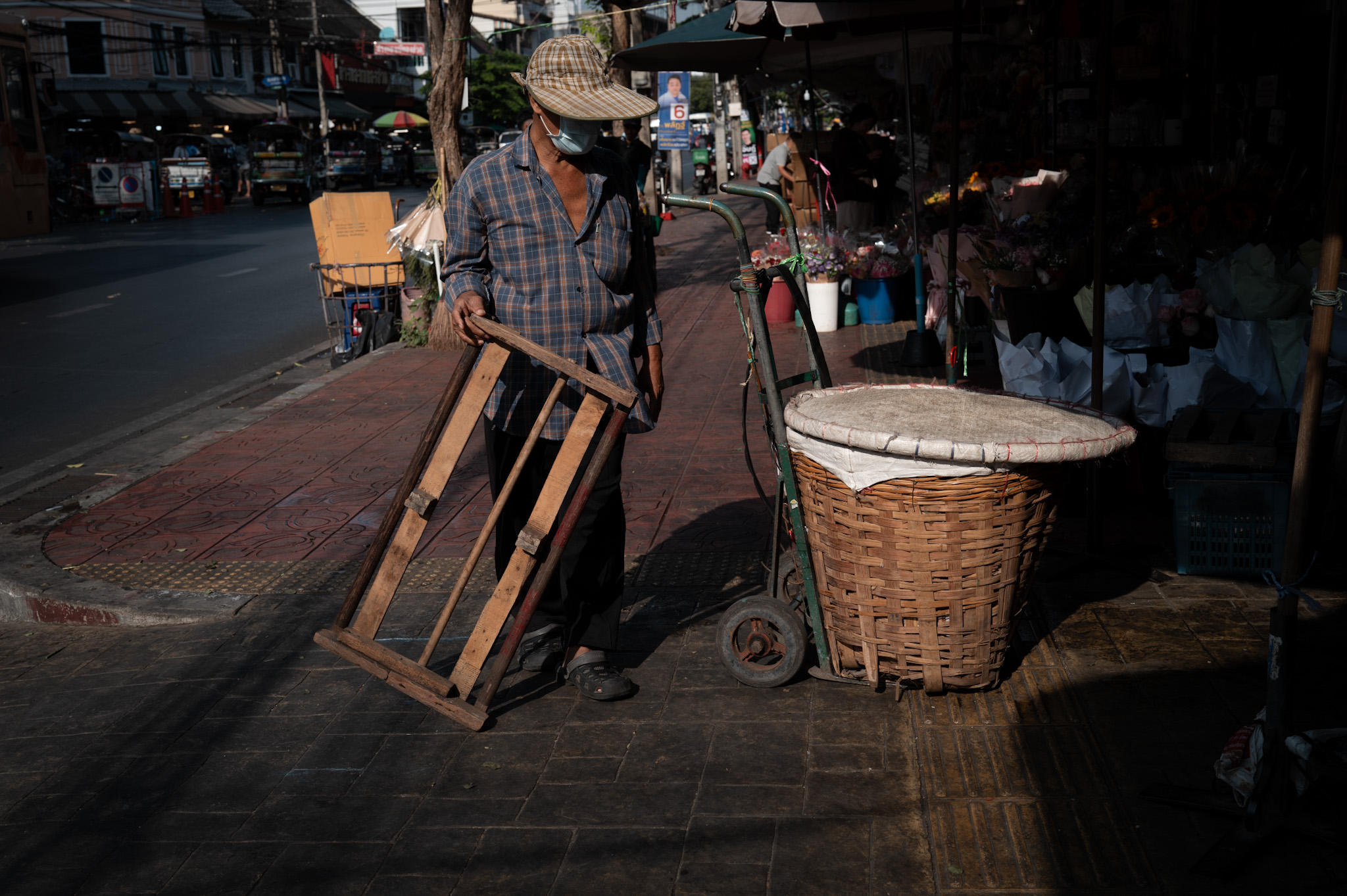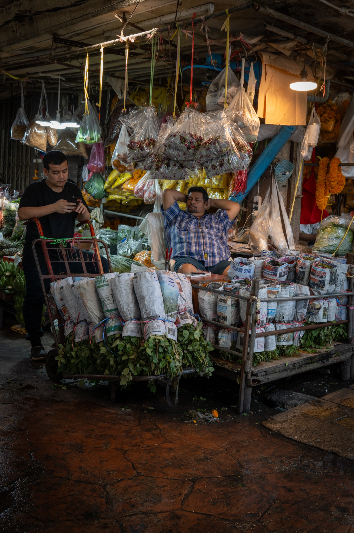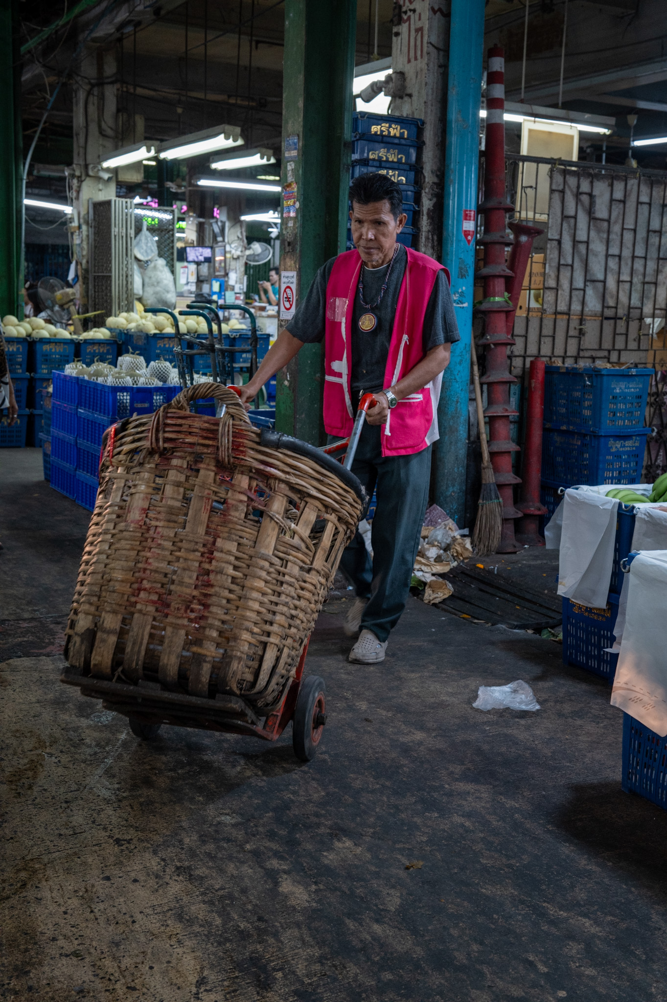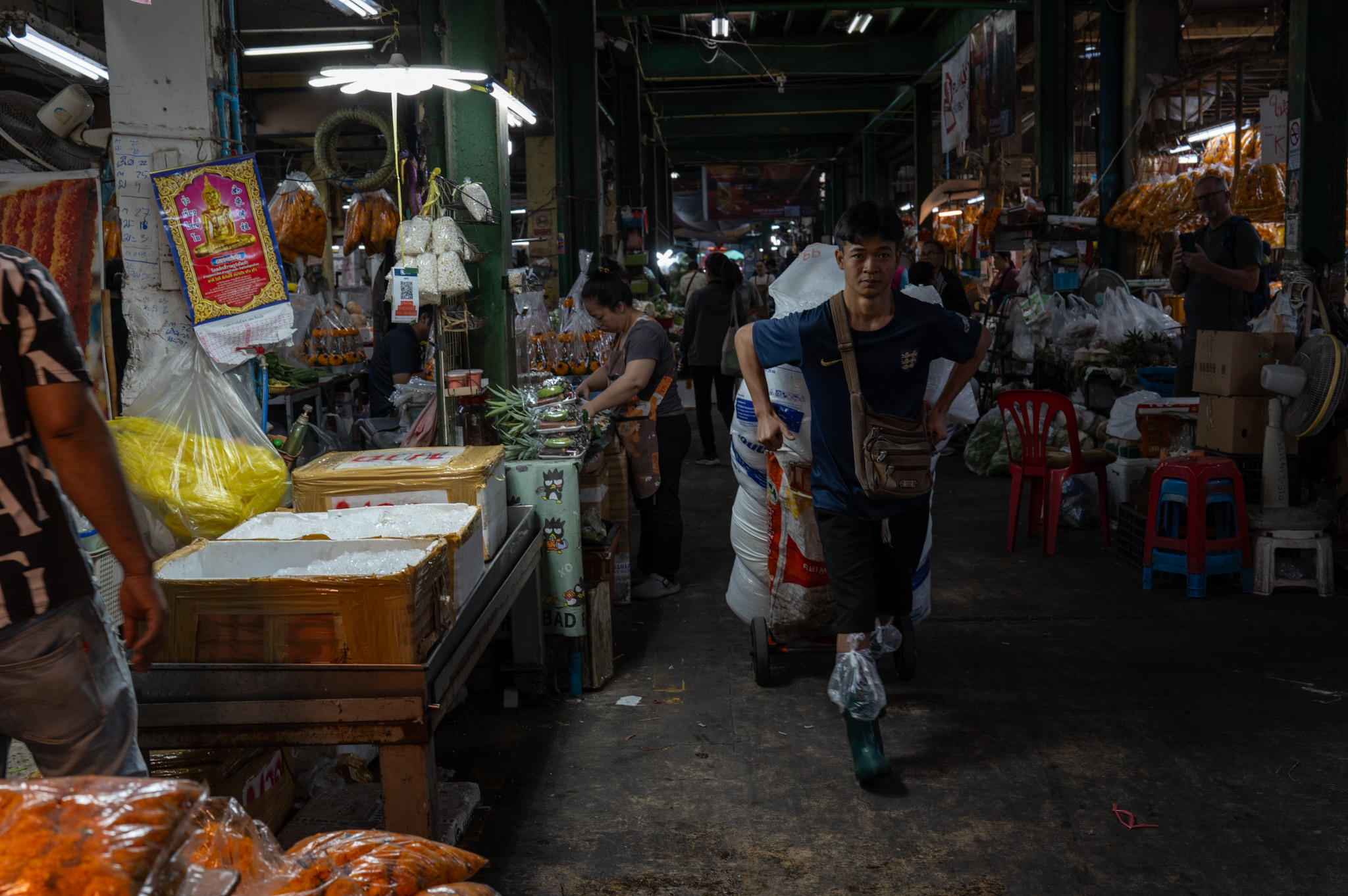 Bundles of flowers are stacked higher than the operator’s head, wrapped in plastic, dripping water. Loads are pushed, not pulled—body weight leaned forward, feet gripping slick floors. There is choreography in the chaos. Trolleys weave between each other with millimetric precision, guided by experience rather than rules. A glance, a pause, a shouted warning in Thai—and the flow continues.