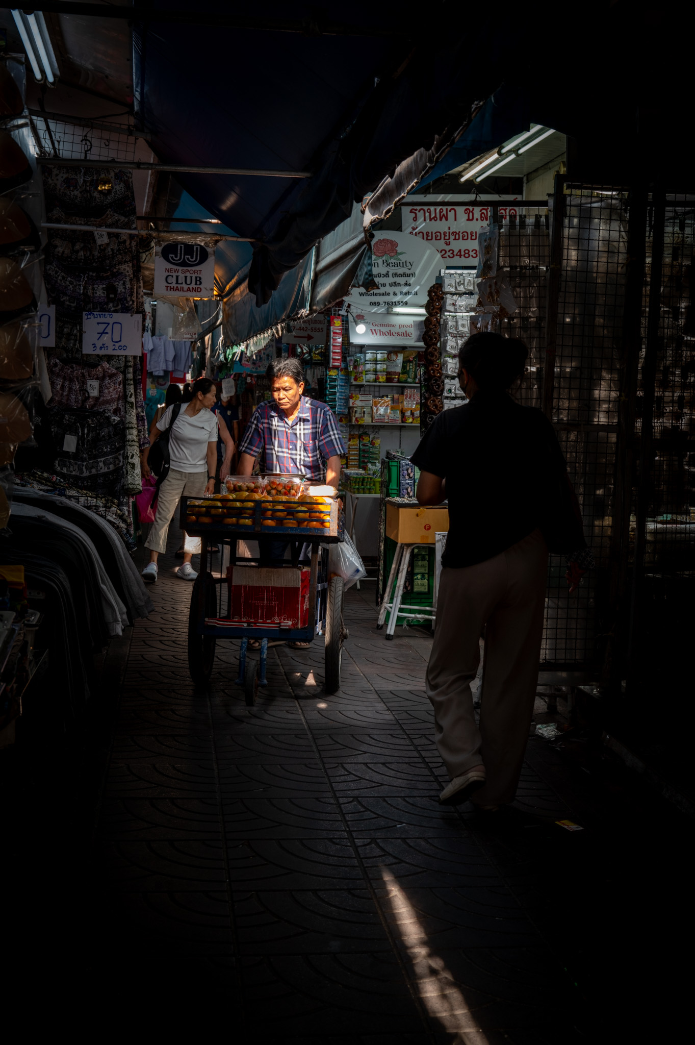 Bundles of flowers are stacked higher than the operator’s head, wrapped in plastic, dripping water. Loads are pushed, not pulled—body weight leaned forward, feet gripping slick floors. There is choreography in the chaos. Trolleys weave between each other with millimetric precision, guided by experience rather than rules. A glance, a pause, a shouted warning in Thai—and the flow continues.