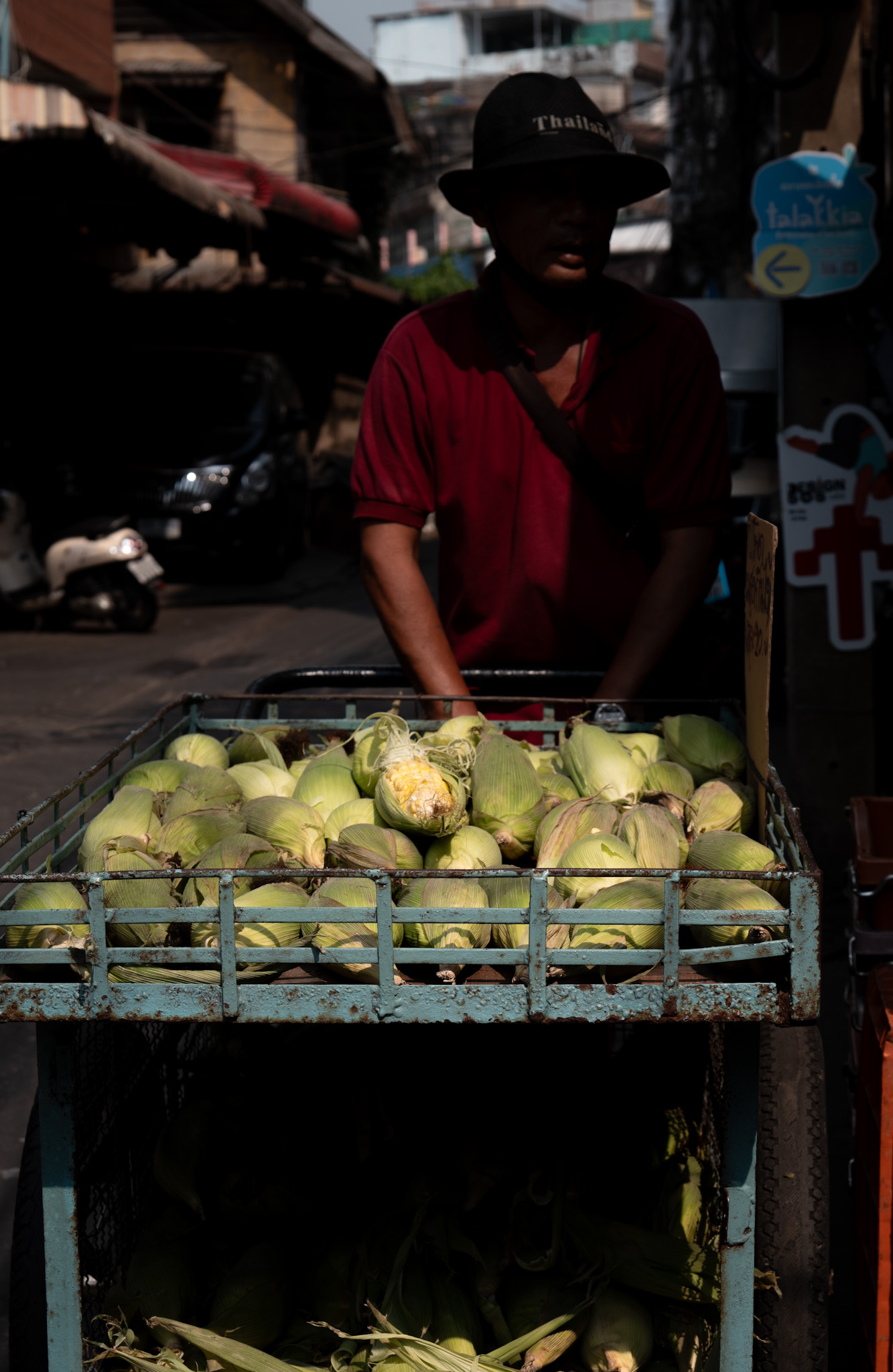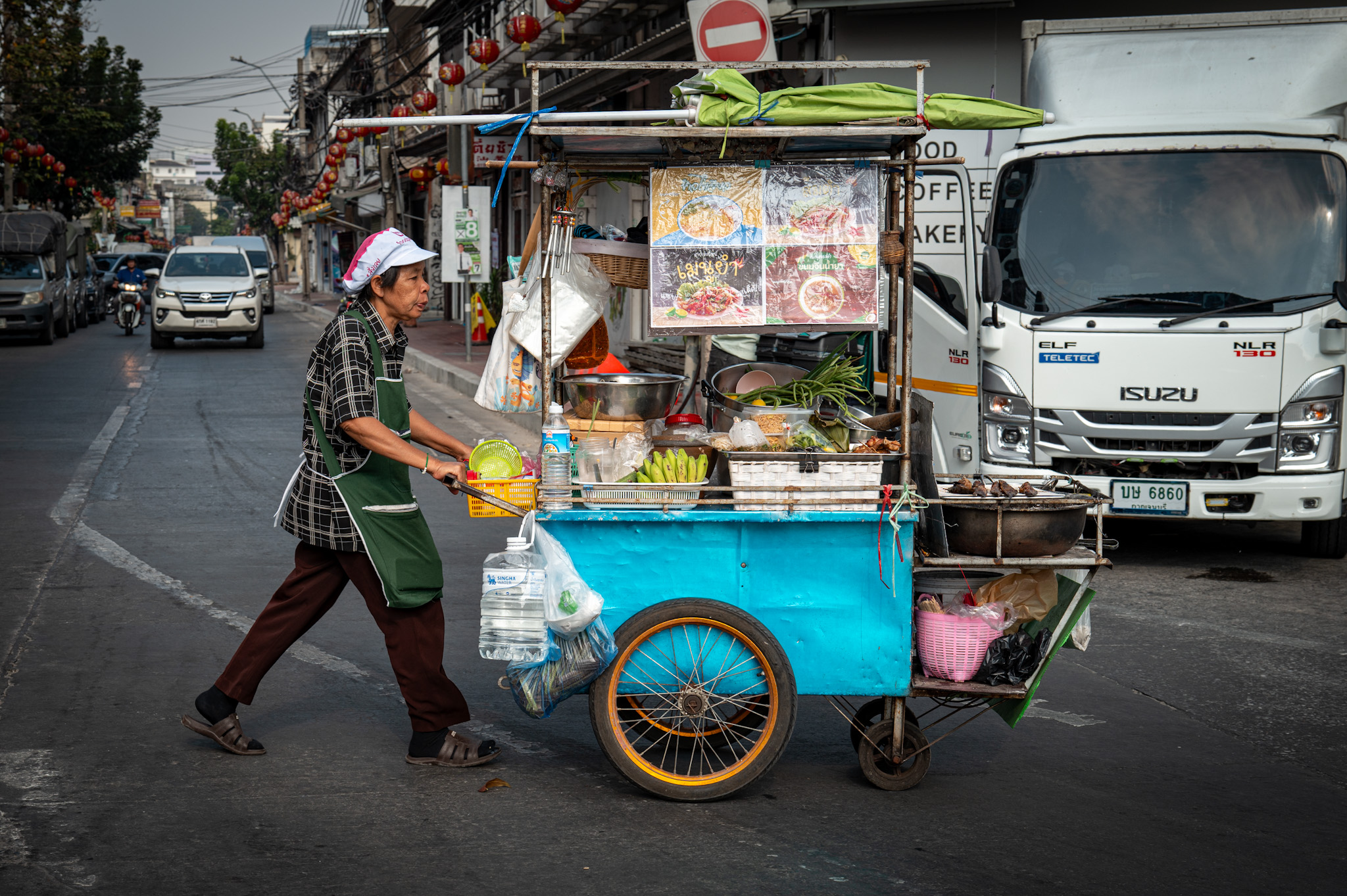 Walk any soi in the late afternoon and you’ll hear it before you see it. The clink of ladles, the squeak of wheels, the soft knock of metal against asphalt. The trolley appears almost shyly, parking itself where foot traffic slows: near a motorbike repair shop, outside a condo gate, under a tree whose shade arrives just in time. A burner flares, a lid opens, steam rises. The restaurant has arrived.